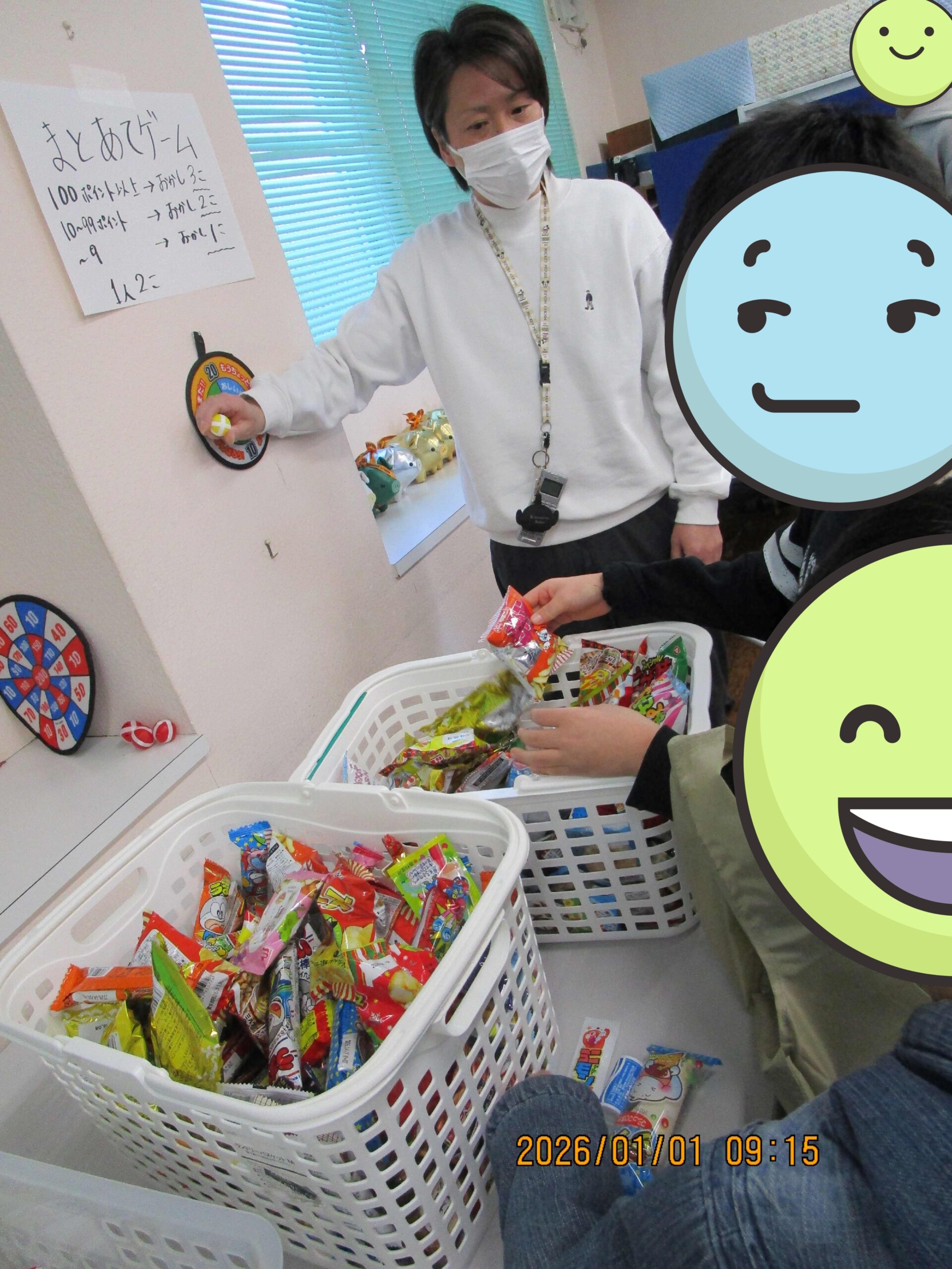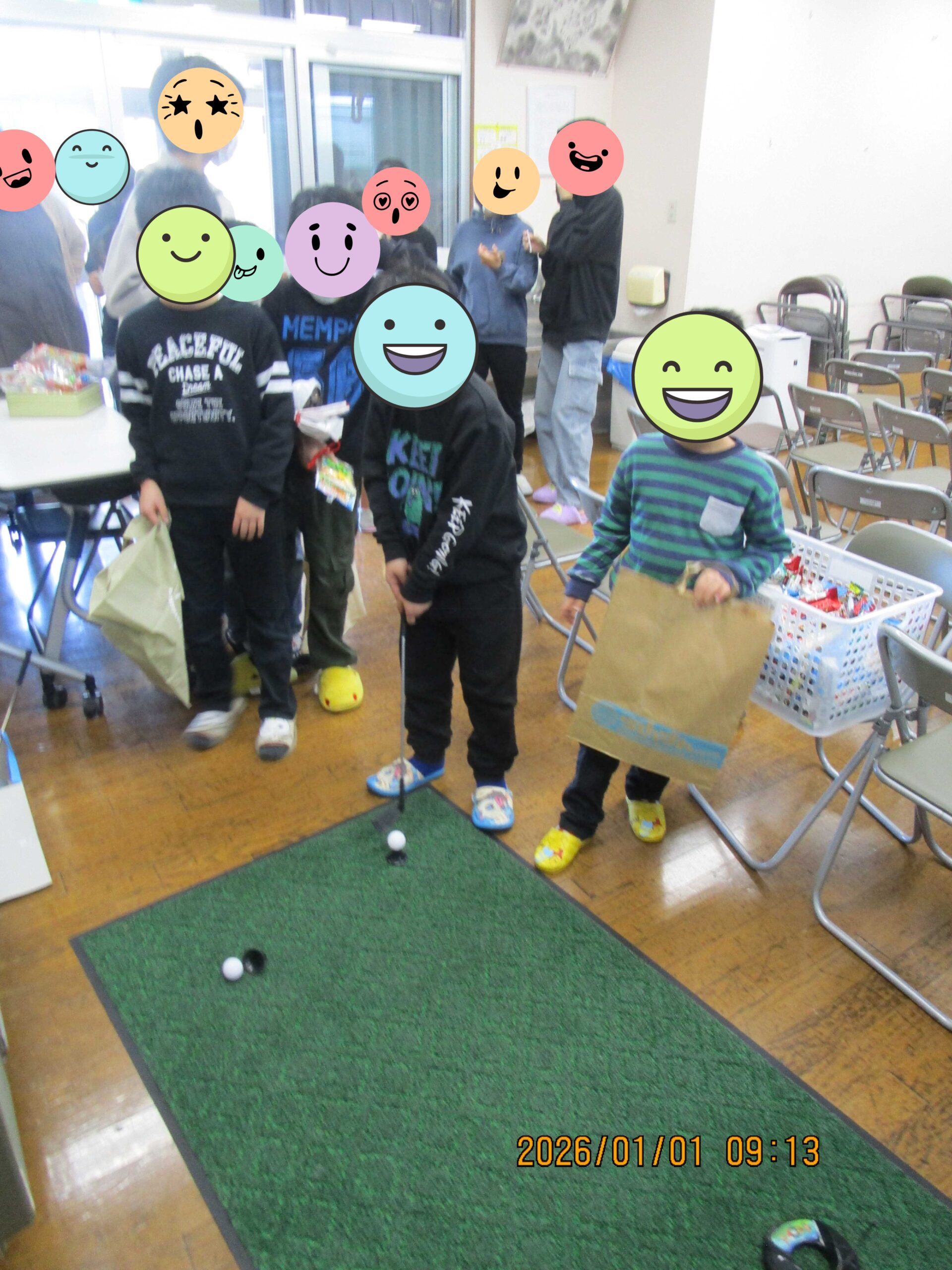 元日は、食堂に一同集まって新年のご挨拶をした後、ひとりひとり園長先生の前で今年の抱負を述べお年玉をいただきました。抱負の順番を待っている間は、くじ引きやパターゴルフ、的当てゲーム、お菓子のつかみ取りなどを楽しみました。大晦日で夜更かしした子どももいましたが、元気な姿で新年会ができて良かったです。
