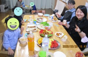令和8年3月7日 新しいステージへ旅立つ卒園生の激励、応援の会を催しました。今年は、3名の卒園生が巣立ちます。お祝いの手紙や学園の生活や行事のスライドから様々な思い出がよみがえりました。壮行会後は、卒園生がリクエストしたごちそうが並び、ケーキとともにお祝いしました。